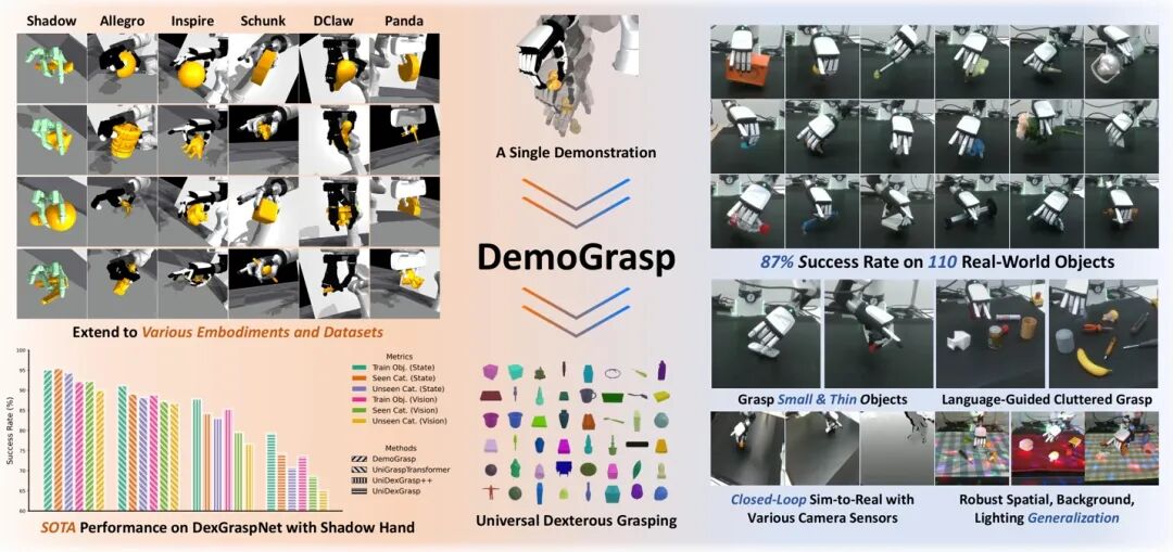 DemoGrasp无需调整任何训练超参数,成功适配6种不同形态的机器人(五指、四指灵巧手,三指夹爪和平行夹爪),在175个物体上训练后,在多个未见过的物体数据集上达到84.6%的平均成功率。