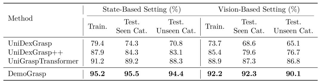 DemoGrasp在该数据集上使用Shadow Hand抓取,性能显著优于现有方法:视觉策略成功率达到92%,训练集到测试集的泛化差距仅1%,且适应大范围的物体初始位置随机化(50cm×50cm)、具备更强的空间泛化能力。