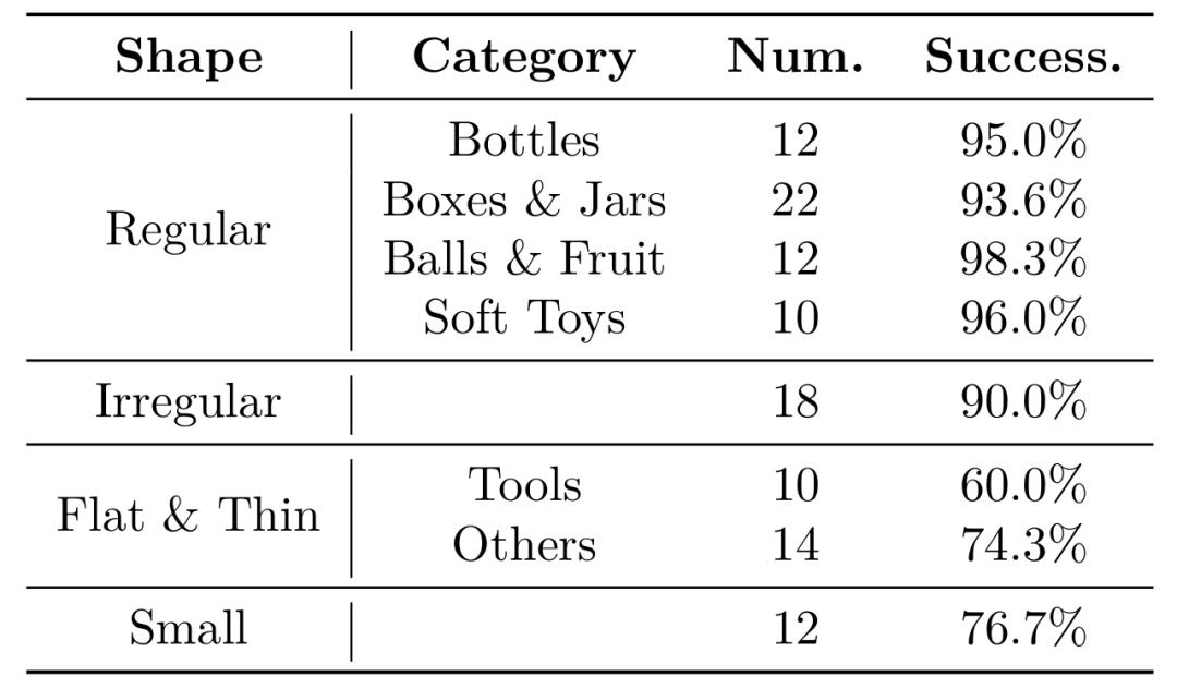 在常规大小的物体分类上,DemoGrasp成功率均达到90%以上;