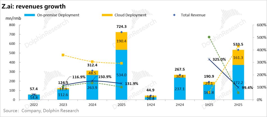 与此相反,市场真正喜闻乐见的API接口与开放平台这种云端部署业务下半年同比大幅增长430%,达到了1.6亿。全年API类业务1.9亿的体量,与MiniMax的1.8亿基本不相上下。而且从增长斜率来看,智谱全年接近300%的增长,比MiniMax 200%更具爆发性。