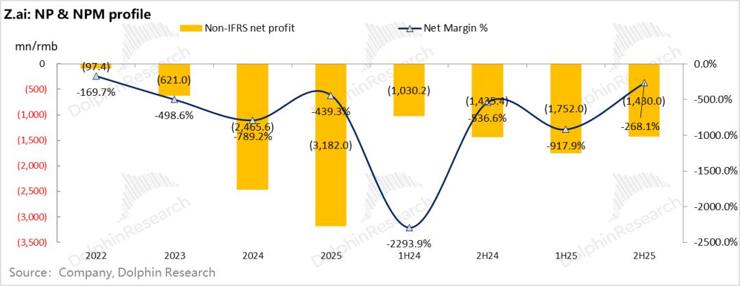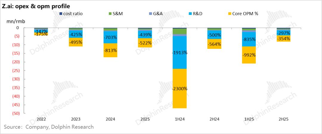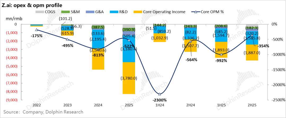 公司管理费用3.2亿,同比增长了290%,相对较快;但与MiniMax一样,智谱销售费用同比负增长25%,下半年仅仅1.8亿(同样是模型获客靠模型本身的能力,而不是靠营销)。