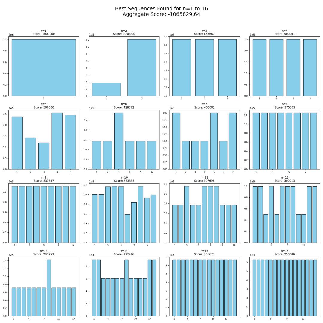 他让AI尝试构造使S尽量小的序列,很快得到n=1到16的数值结果: