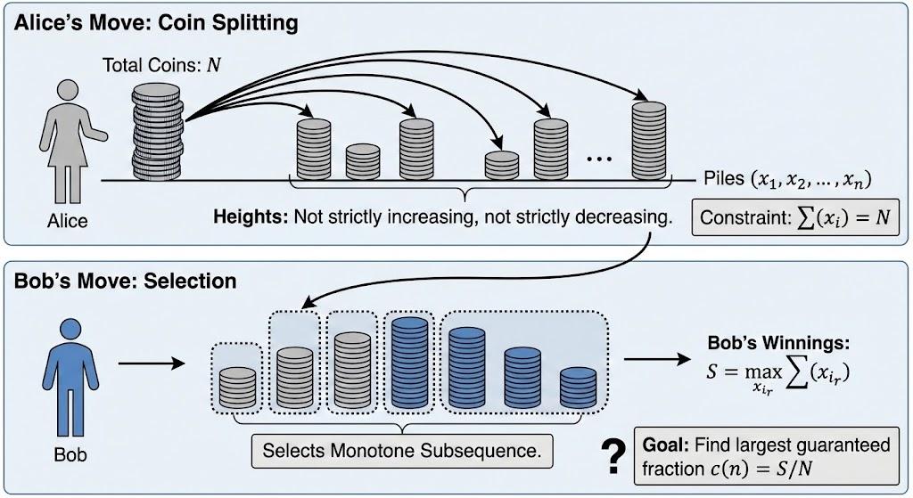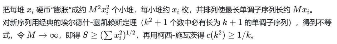 如果Alice把硬币分成k2堆,每堆差不多大,并排列成k个递减块,每块k 堆,块之间递增,那么最长单调子序列只有k堆。
