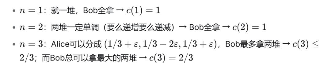 这意味着√n·c(n)→1,Bob在n很大时几乎能保证拿到约1/√n的比例。