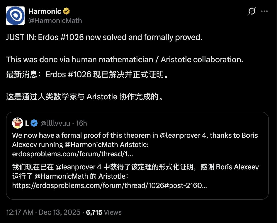 Harmonic官网也宣布了这一消息,其AI系统Aristotle参与了此次解题过程。