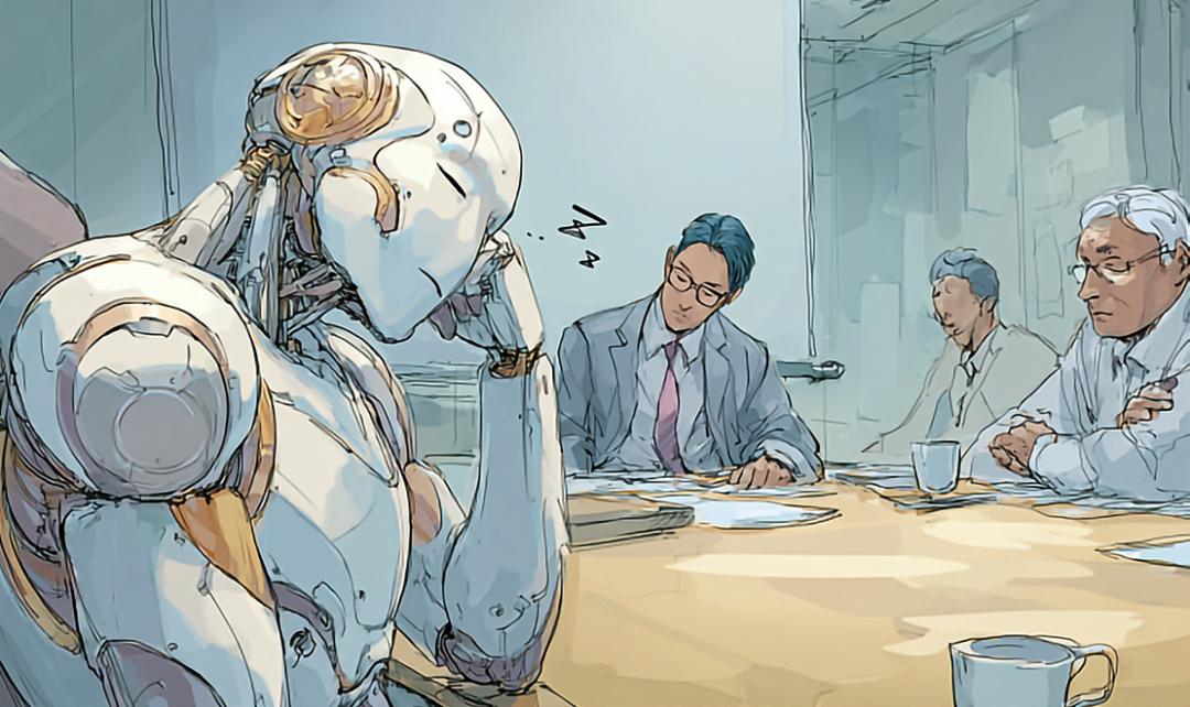 调研中,公司员工提出的最普遍的问题是:如何给AI下指令?AI更像那个公司里有能力但爱偷懒的同事,它能够解决问题,但不会主动思考,高度依赖准确的指令和激励。有趣的是,当我让AI画一幅自画像时,得到的就是一个在会议室打瞌睡的形象(图2)。所以,公司里AI用得最好的人是对业务痛点最了解的人,优秀的员工才能用上优秀的AI。