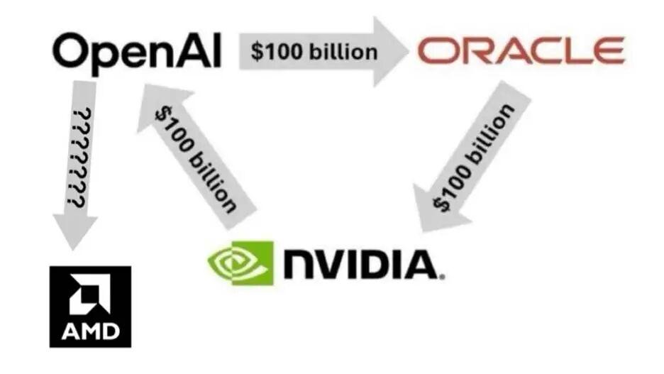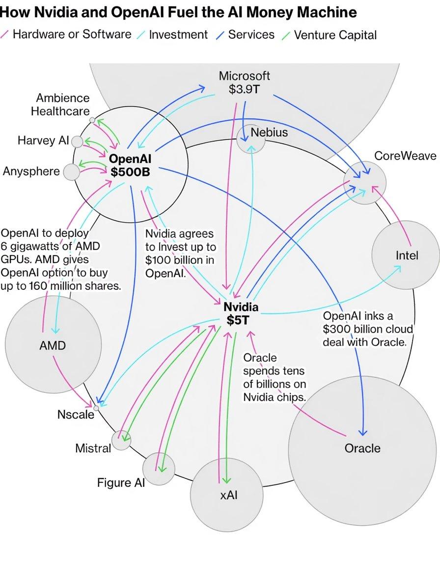 最近,一张资本内循环的示意图在硅谷疯传,箭头从投资者指向 OpenAI,从 OpenAI 指向英伟达,再从英伟达绕回 OpenAI 的股东名单。钱在几家科技巨头之间画了一个圈,成为了 AI 繁荣在市场层面的写照。