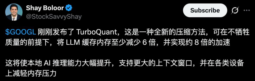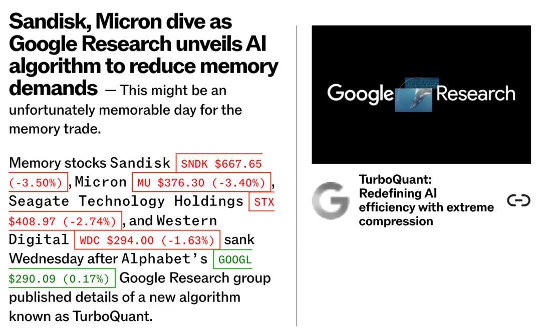 直白讲,谷歌TurboQuant出世,直接冲击了芯片存储巨头们,备受追捧的AI硬件逻辑。