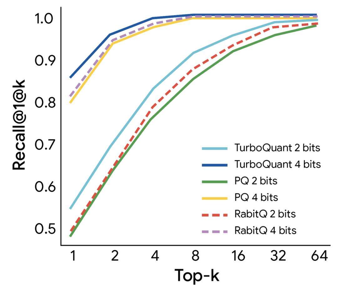 在高维向量搜索方面,TurboQuant也没有放过对手。