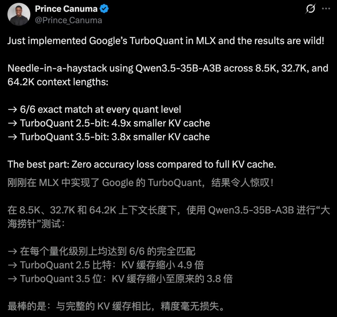 另一位开发者Prince Canuma实测后惊叹道:「面对8.5K到64.2K不等的大跨度上下文,TurboQuant让模型对显存实现极致压缩」。