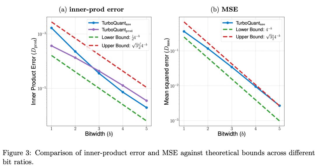 论文给出了严格的理论证明:TurboQuant的MSE失真率,在所有位宽下都控制在理论绝对下限的约2.7倍以内。在1-bit极端压缩的情况下,更是只有最优值的约1.45倍。