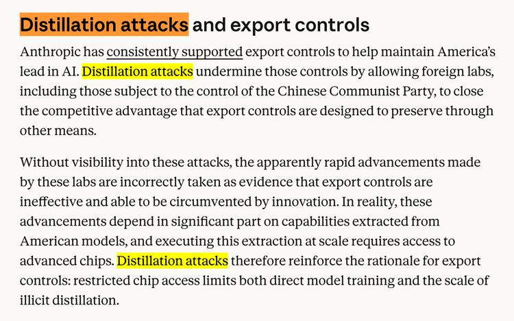 Anthropic称这种行为为"蒸馏攻击"(distillation attacks),并将其上升到了国家安全的高度,声称这些行为不仅违反了服务条款,还"强化了出口管制的合理性",甚至可能帮助"部署前沿AI用于进攻性网络行动、虚假信息运动和大规模监控"。
