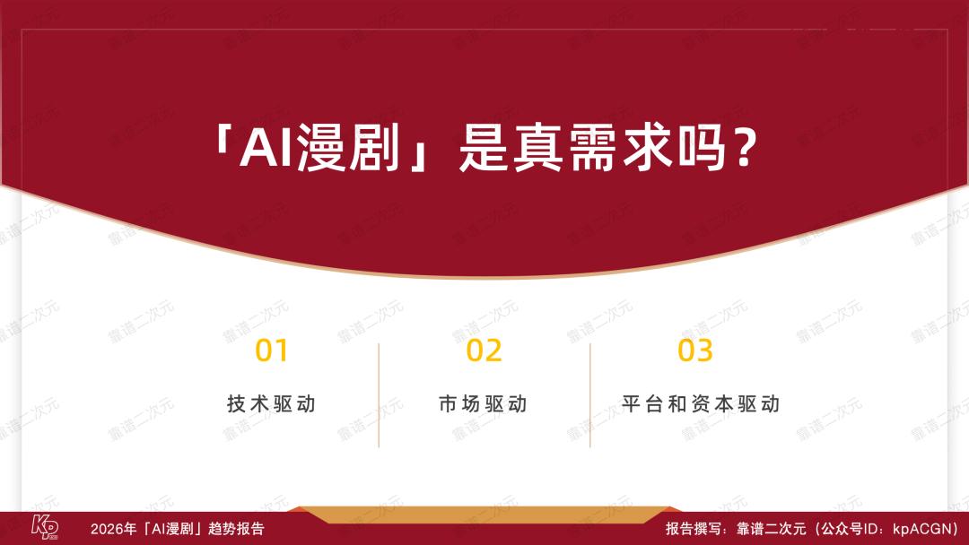 正是在这样的时间,靠谱二次元出品这份「2026年AI漫剧趋势报告」。我们认为当下的AI漫剧行业需要一份兼具基础科普功能和产业趋势洞察的深度报告,为关注AI漫剧的相关人士提供宏观层面了解产业的参考资料,也旨在为风口一线匆忙赶路的从业者提供一次驻足思考的契机。