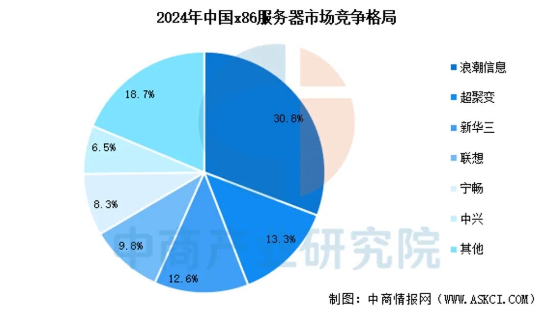 以x86服务器为例,根据IDC报告显示,2024年中国x86服务器市场中,浪潮信息以30.8%的市场份额排名第一,第二名是超聚变,年市场份额为13.3%,新华三则以12.6%的市场份额位居第三,前三名加起来就占据市场半壁江山,尾部厂商竞争必然更加激烈。