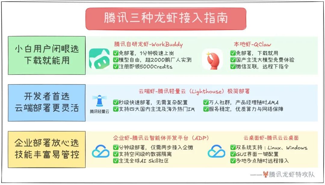 从QClaw到WorkBuddy,从腾讯云轻量部署到微信ClawBot,腾讯的五款“龙虾”产品不是各自为战的散兵游勇,而是一套完整的战略布局:以QClaw降低个人用户门槛,以WorkBuddy卡位企业市场,以腾讯云提供算力支撑,以企业微信和QQ覆盖协同场景,最后以微信ClawBot完成生态合围。