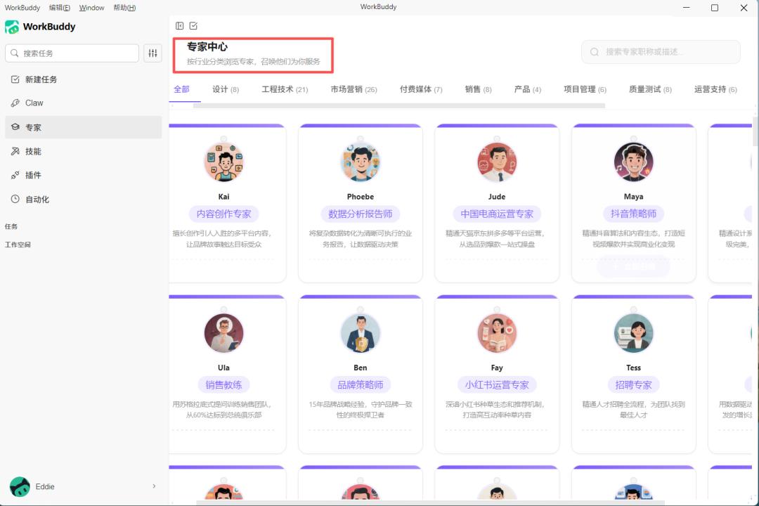 此外,WorkBuddy还有着诸多实用功能,比如自动化规则可设置“触发条件+执行动作”,实现重复工作的自动完成,批量文件处理功能可一次性处理多份合同、简历等文档,大幅提升办公效率。同时,WorkBuddy还上线「专家」功能,聚合腾讯141位专业领域顾问,从品牌策划、小红书运营、到游戏设计、财务分析多领域技能。