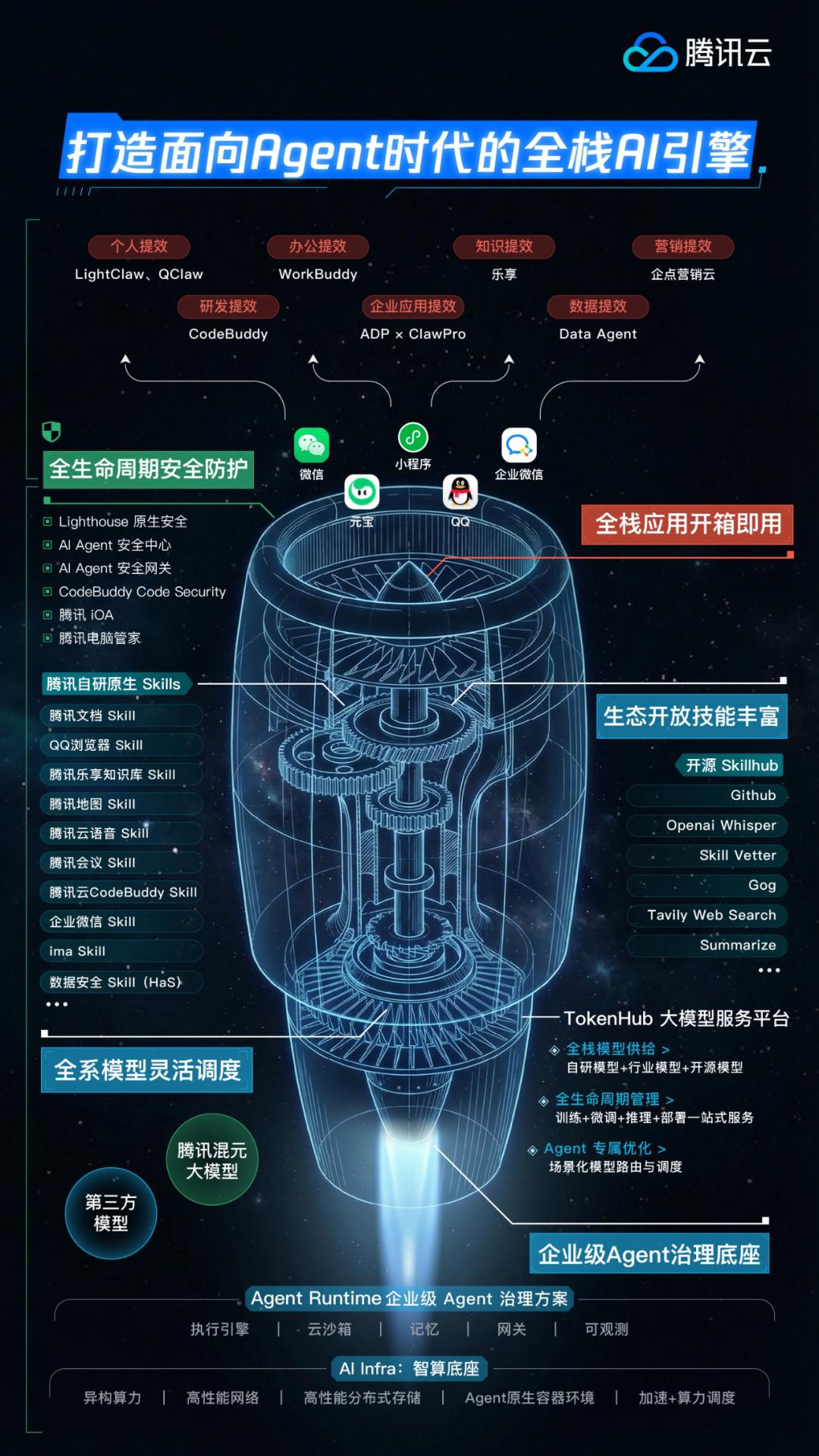 而在腾讯“养虾”布局持续升温之际,腾讯云于3月27日,正式对外发布了面向Agent时代的全栈AI引擎,并首次完整披露其Agent产品全景图。与前面阶段的产品各自为战不同,此次全景图的发布,意味着腾讯开始在内部统一技术标准、共享底层能力,试图解决多团队并行带来的资源分散与标准割裂问题。