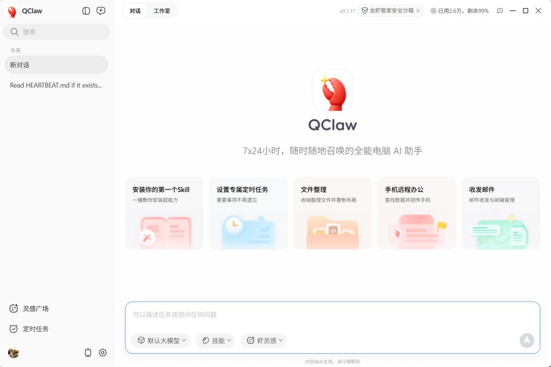 QClaw由腾讯电脑管家团队推出,主打本地化部署,也是最贴近普通用户的“本地虾”。依托腾讯电脑管家18.0版的“龙虾管家”功能,QClaw为AI打造了专属“隔离房”,开启后AI仅能在指定范围内完成任务,无法触碰电脑内的私人文件,有效规避了数据安全风险,让用户在享受AI便捷的同时,无需担心隐私泄露问题。