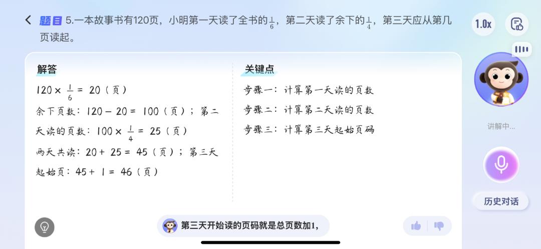 豆包爱学的讲解过程像“打电话”,通过语音和文字实时交互,语言风格也更显亲切;千问智学的讲解则是典型的聊天机器人模式,虽然也能语音朗读,但交互性稍弱。
