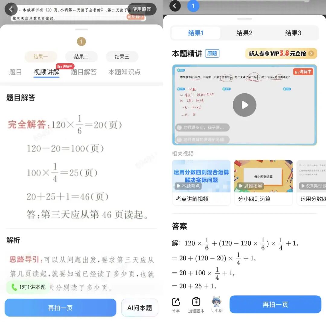 进一步观察,猿辅导和作业帮的AI讲解的风格也截然不同。小猿的AI老师讲题如同“一对一网课”,有板书、有互动,可以随时打断提问。而作业帮的AI讲解则更像一份“解题报告”,单向输出,缺乏交互。
