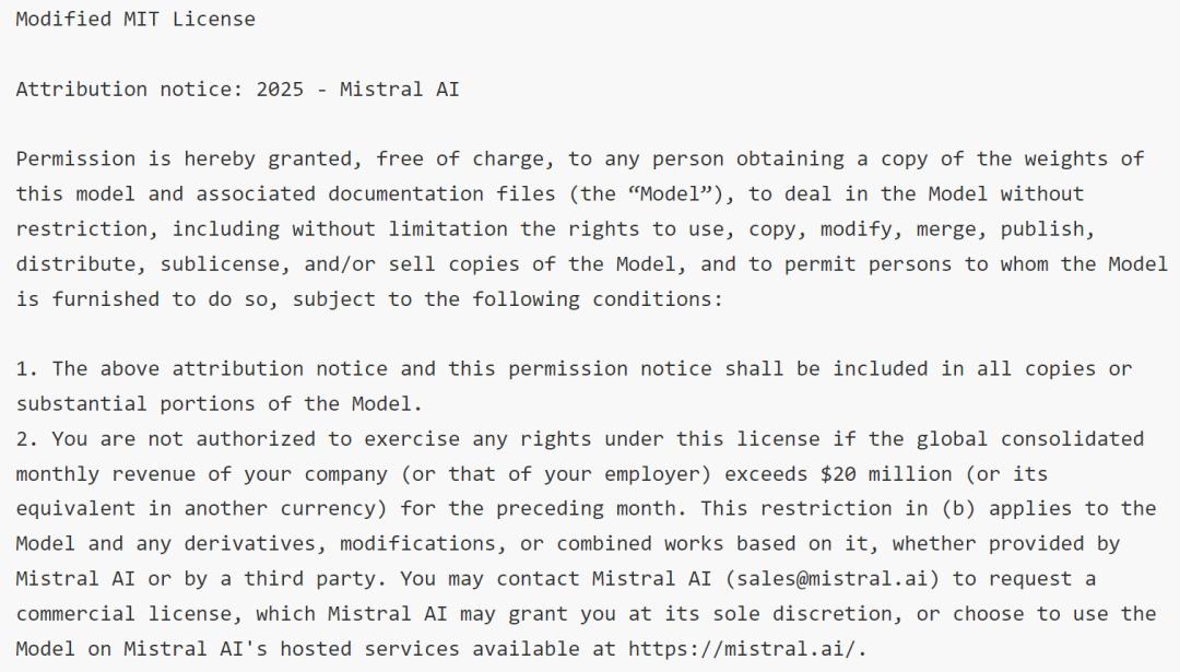 即如果你的公司全球合并月收入超过 2000 万美元,你将无权行使本许可证下的任何权利。也就是说,超过收入门槛的公司必须联系 Mistral AI 购买商业授权,或者使用他们的付费 API 服务。