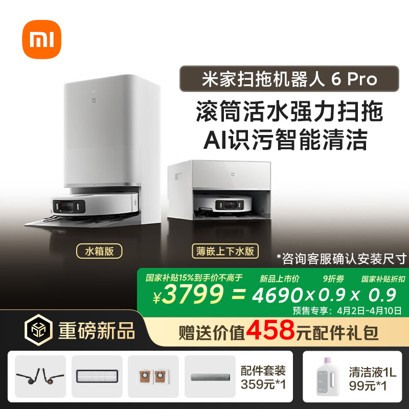 IT之家 4 月 2 日消息,小米米家扫拖机器人 6 Pro 今日在京东等平台上架预售,预计 4 月 10 日开售。新品分为水箱版以及上下水版,上市价 4690 元起,叠加 9 折优惠券以及国家补贴,到手价 3799 元起。