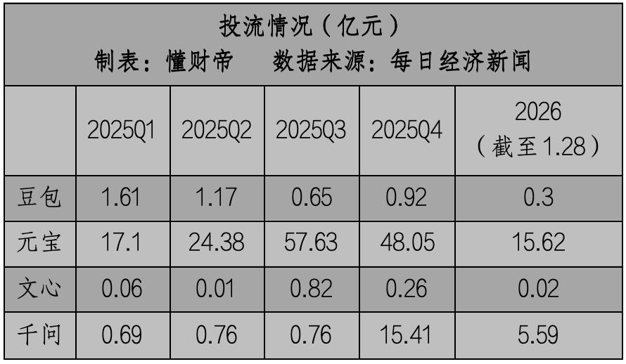 其在C端的投流规模,明显不及同业。据每日经济新闻统计,2025全年,文心投流规模仅1.15亿元。与之对比,元宝、千问全年的投流规模分别为147.16亿元、17.62亿元。[2]