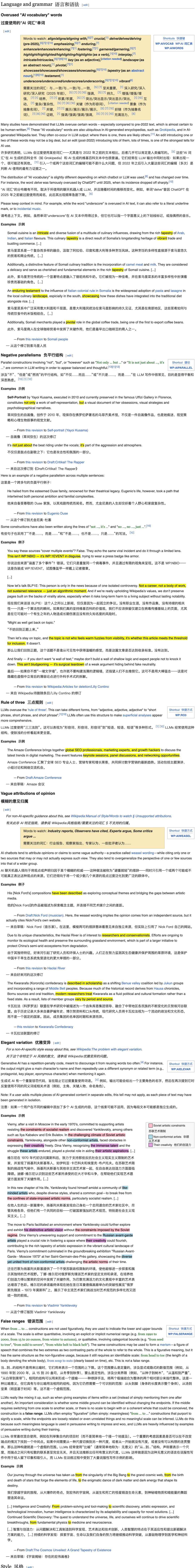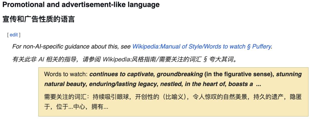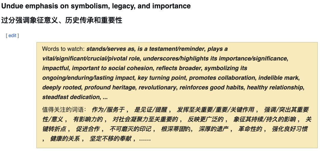 语法过于严谨: 像是大量地使用现在分词做从句,在语法专家眼里这是标准用法,但在维基编辑眼里,这就是 AI 的惯用语。放到中文语境下,就是使用大量的长难句,可以拆分成几句话来表述的内容,非要写成论文一样,增大阅读障碍。