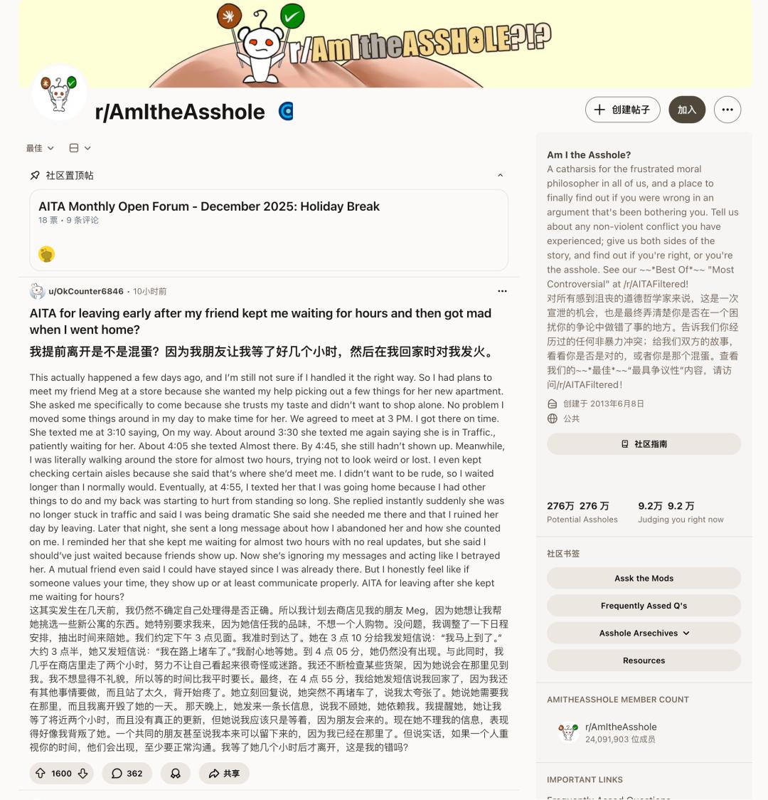 Reddit「我是混蛋吗」版块有超过 2400 万成员,里面分享的内容大多是个人故事