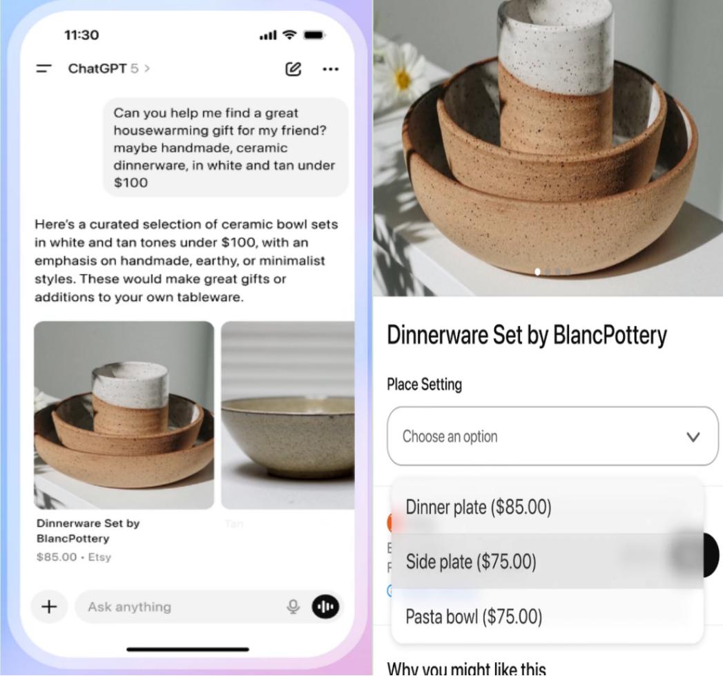 9月29日,ChatGPT上线了 Instant Checkout(即时结账/支付),接入Esty、Shopify两家平台,朝电商业务迈进了更加实质的一步。