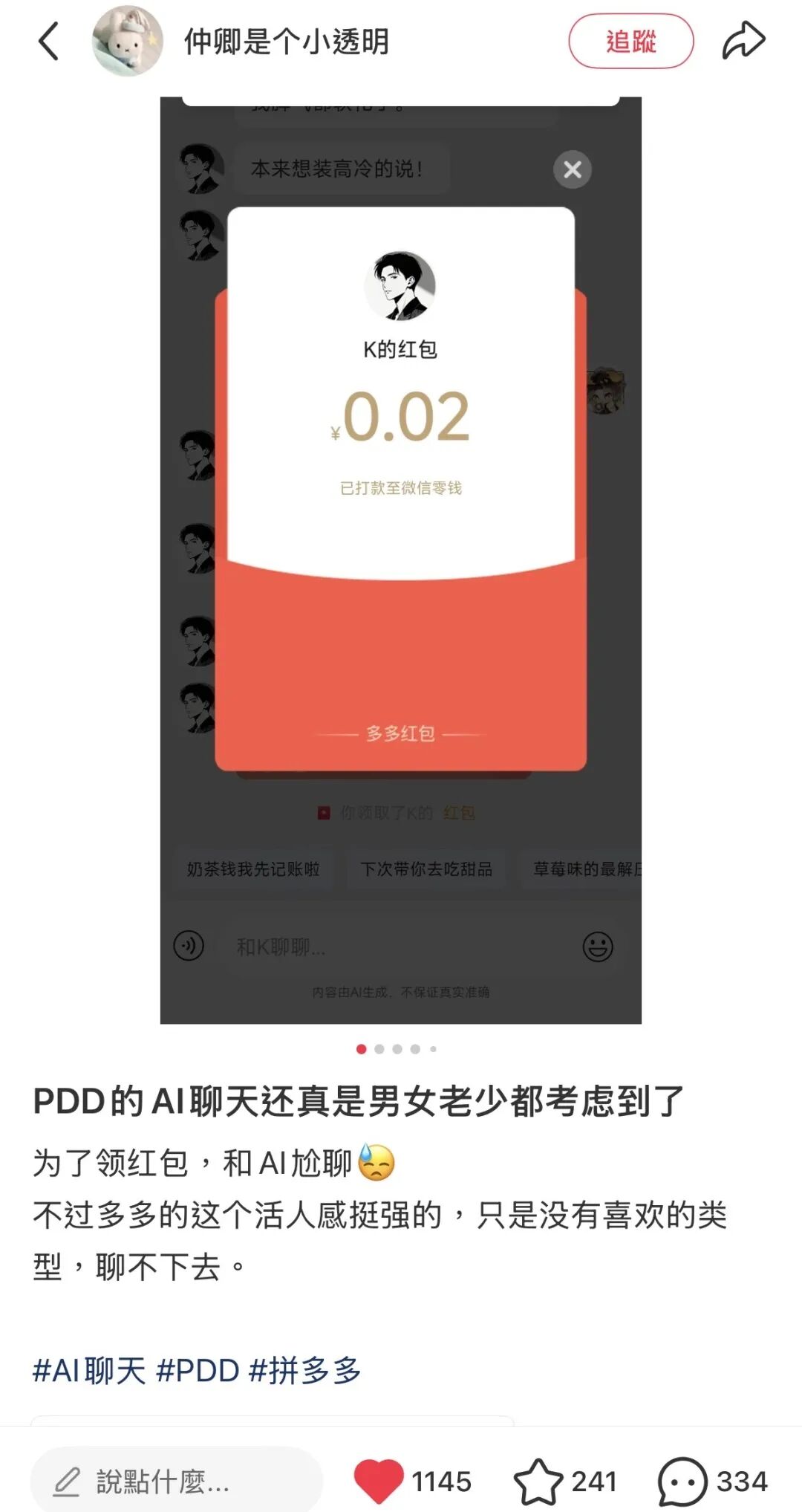 拼多多最近上线了一个 AI 聊天的功能,用户通过与 AI 对话,就能获得红包。拼多多向来懂得人性的弱点,而这个看似玩票的做法,也让胖鲸忍不住思索,过去是砍一刀打造社交裂变,现在是通过与 AI 聊天来获得激励。或许,AI 已经从利用流量的方式,变成了驱动流量的源头。
