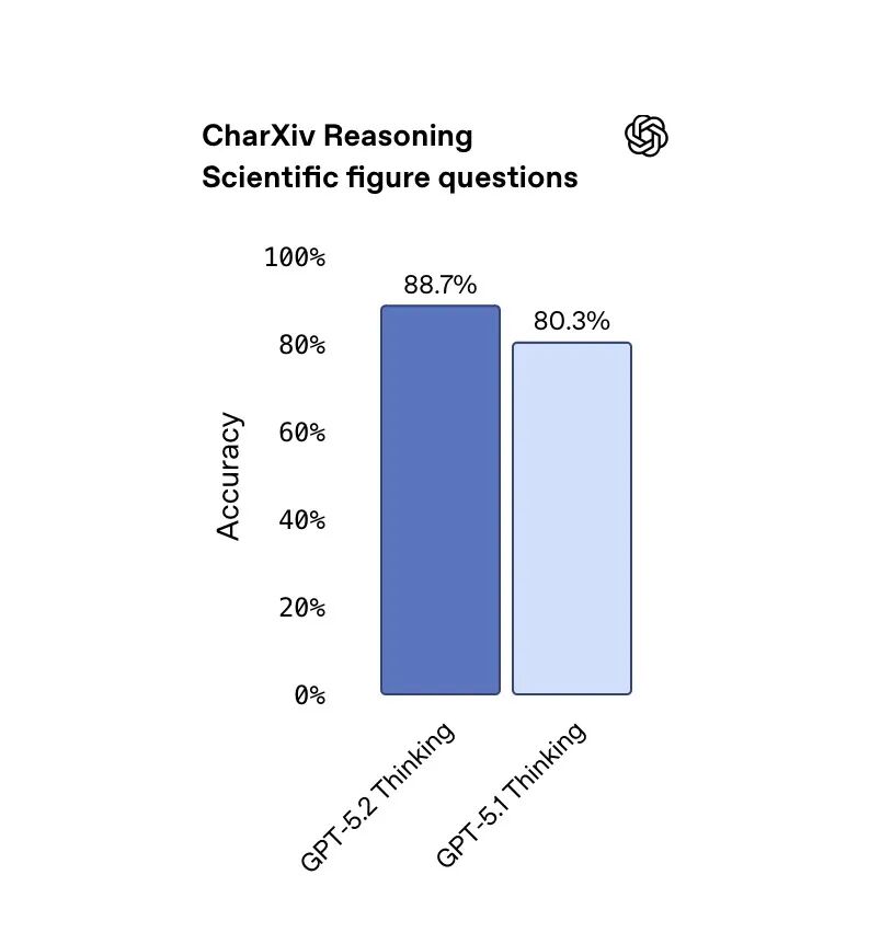 在视觉能力方面,GPT-5.2 Thinking的图表推理和界面理解能力显著增强。其软件界面识别错误率减少约一半,在CharXiv(科研图表推理)中准确率提升约8个百分点。OpenAI同时对模型加入了大规模软件 UI数据训练,使其更准确理解控件、菜单层级与界面逻辑关系。