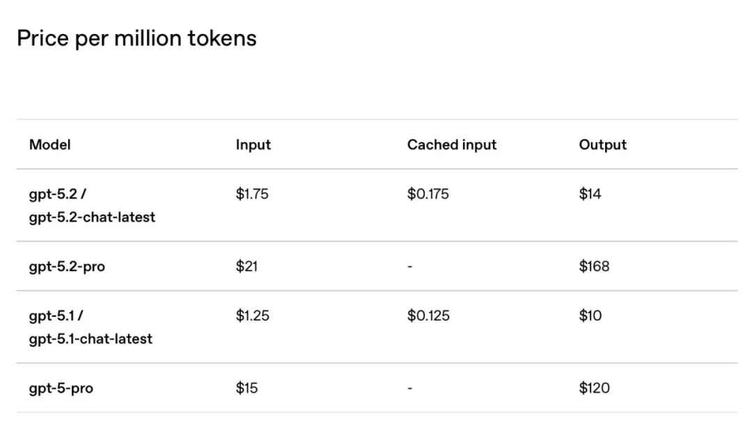 其中GPT-5.2 Instant与GPT-5.2 Thinking采用统一计费标准,输入单价为每百万tokens 1.75美元,输出单价为每百万tokens 14美元;高端版本 GPT-5.2 Pro定价更高,输入单价达每百万tokens 21美元,输出单价为每百万tokens 168美元。
