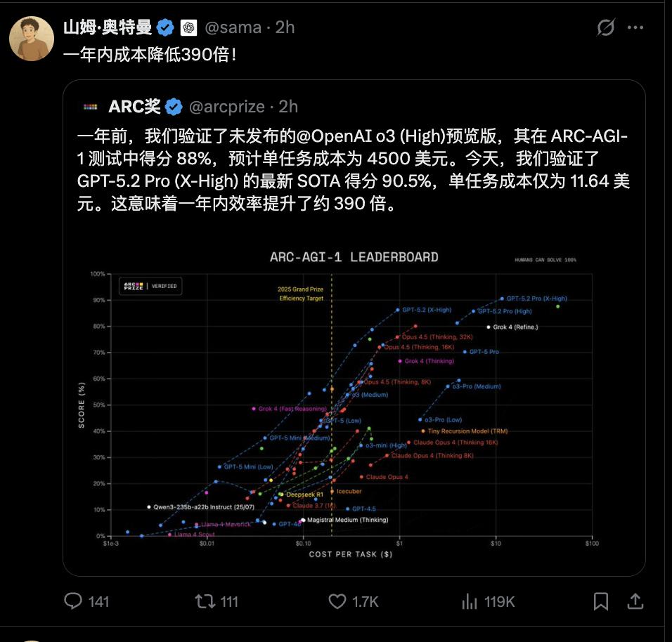 同时,ARC Prize(ARC-AGI)被业界公认为目前最难、也是最能体现 AI “通用智能(AGI)”水平的基准测试。根据ArcPrize的测算,GPT-5.2的性价比继续提升,一年内效率提升了约390倍。