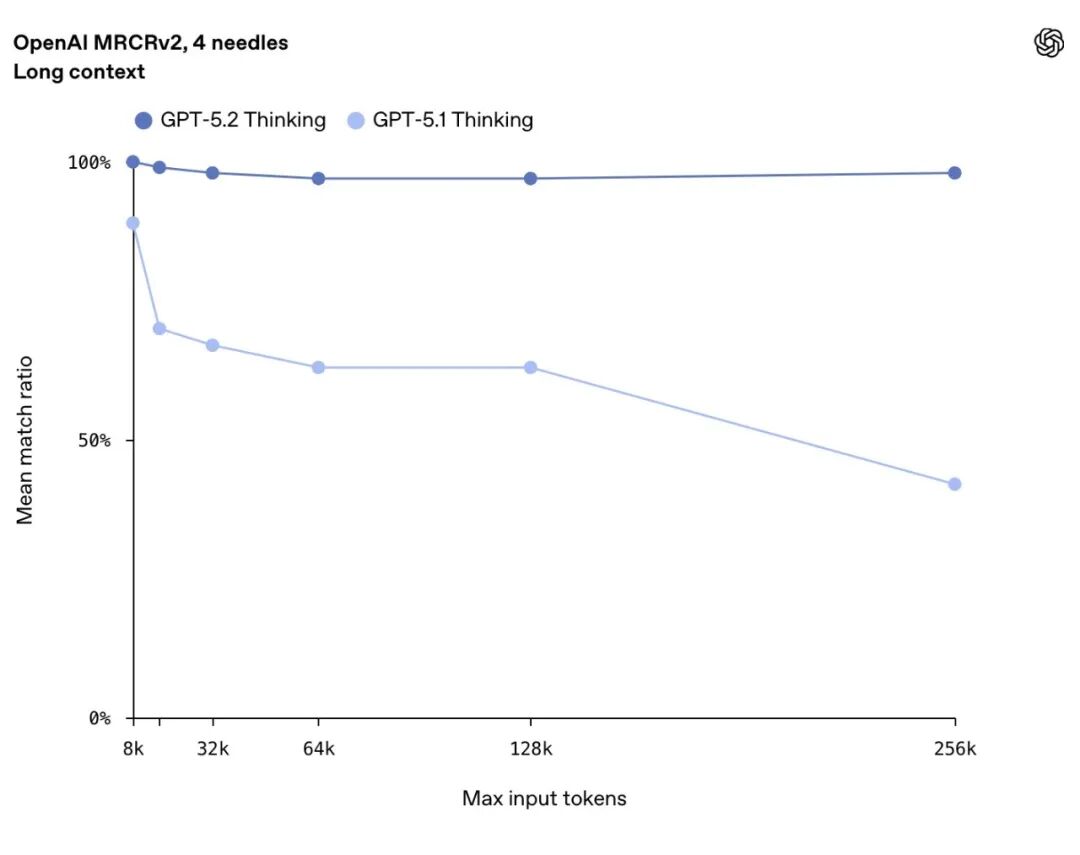 在长上下文推理方面,GPT-5.2 Thinking支持最高256k tokens输入,并在“四针(4-needle)”检索任务中实现接近100%准确率,超过已有商用模型的水平。