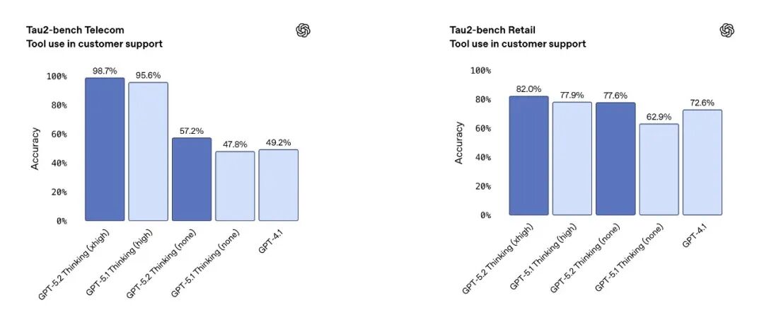 企业工作流往往涉及跨系统的复杂操作。在智能体任务方面,GPT-5.2 Thinking在Tau2-bench Telecom多轮客服任务的工具调用测试中取得98.7%完成度,该评测覆盖订票、退款、延误补偿、物品遗失与跨系统调度等场景,反映其可承担更高自治度的流程任务。