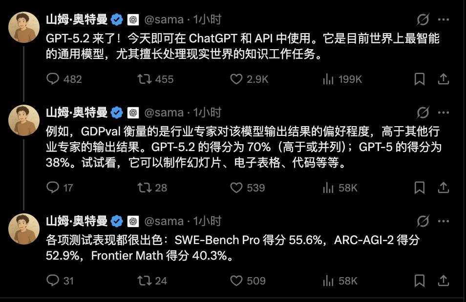 本次发布包含三款模型:GPT-5.2 Instant(优化响应速度)、GPT-5.2 Thinking(深度推理)、GPT-5.2 Pro(高端版本)。