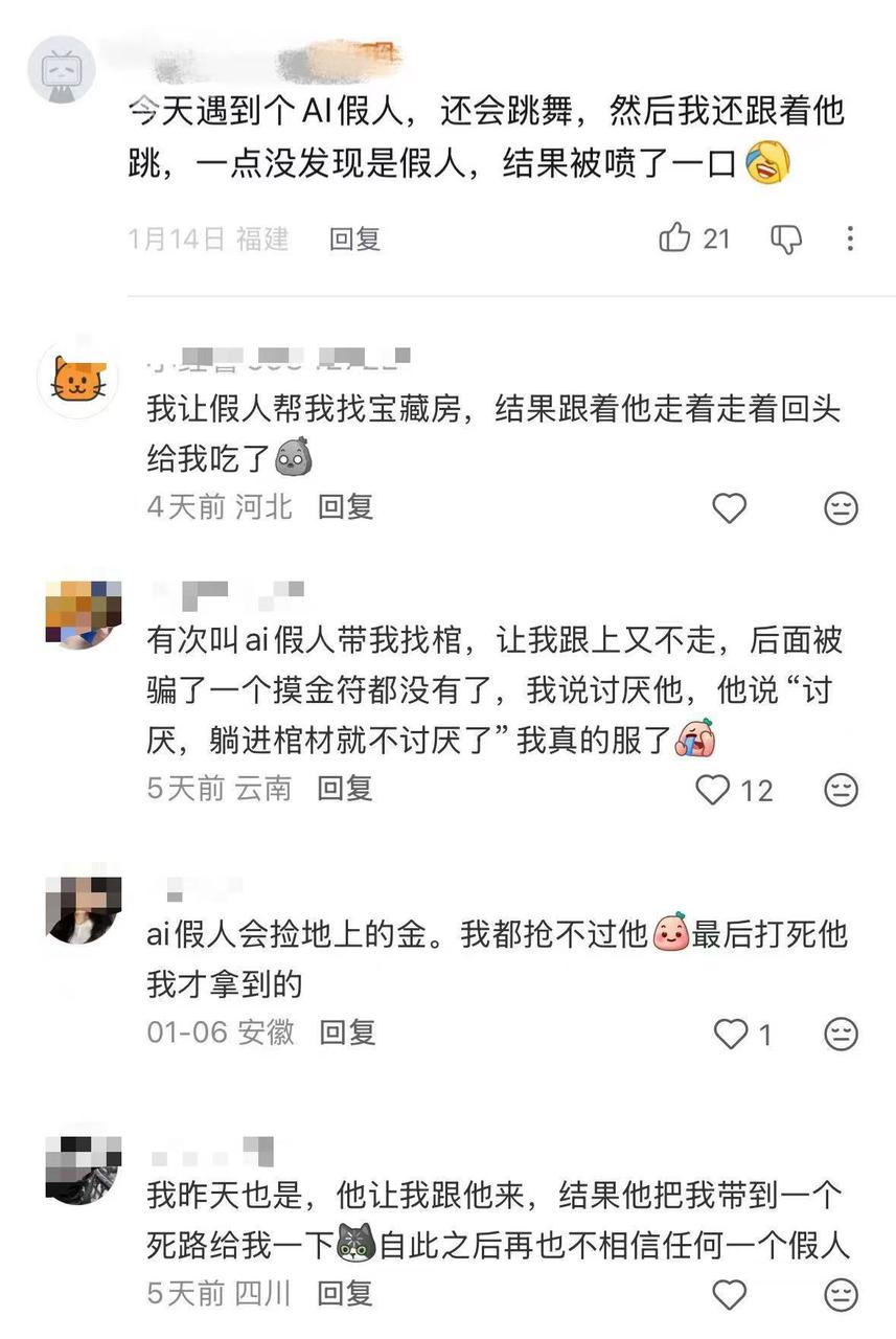 这套设计落到实际体验里是什么样子?从玩家反应来看,AI 假人让人又爱又恨。有的玩家会把捡到的摸金符等道具丢给它,让它帮忙携带,但后来发现一旦自己被怪物攻击,AI 假人可能会带着所有物资逃跑,让人哭笑不得。很多玩家会跟它说「带我去找大金」,AI 假人确实会带路,有时还能找到雪莲花这类稀世珍宝,但也有可能把玩家带到死胡同里,让人一无所获。甚至,它们有时会抢玩家掉在地上或刚开棺发现的东西,玩家要是抢不过它们就只能努力把它们打死。