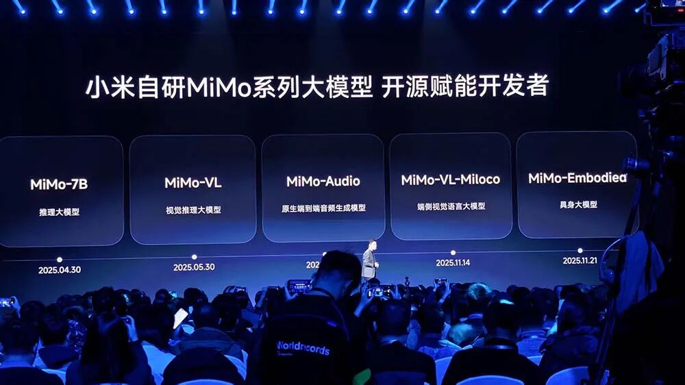 在大家最关心的AI方面,小米自研MiMo系列大模型家族赫然呈现:推理大模型、视觉推理大模型、原生端到端音频生成模型、端侧视觉语言大模型、具身大模型。