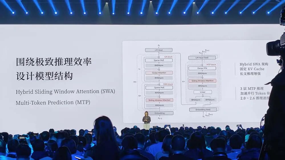 具体来看,小米围绕极致推理效率来设计模型结构,采用了Hybrid SWA架构,固定KV Cache,增强长文推理,此外,团队采用3层MTP推理加速并行Token验证,实现推理速度2-2.6倍的提升。