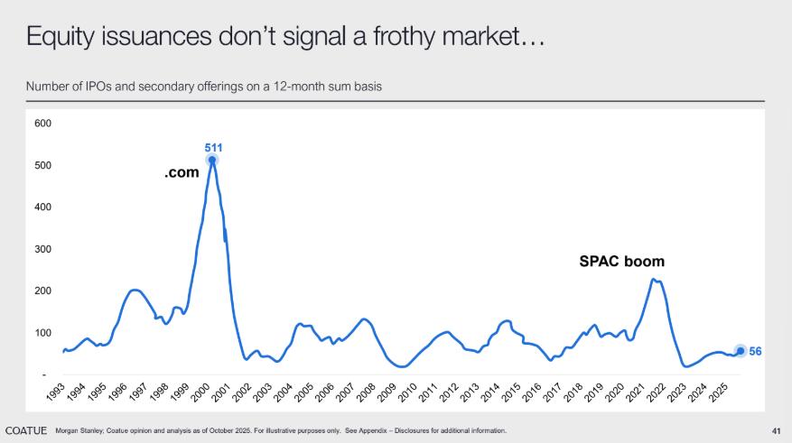 在判断当前市场是否存在泡沫时,IPO 市场与杠杆水平呈现出截然不同的信号。以 12 个月为周期的 IPO 和二次发行数量当前仅为 56 起,远低于互联网泡沫时期的 511 起和 SPAC 热潮时的峰值,这说明 equity 市场并未呈现出过热的 “泡沫化” 特征。