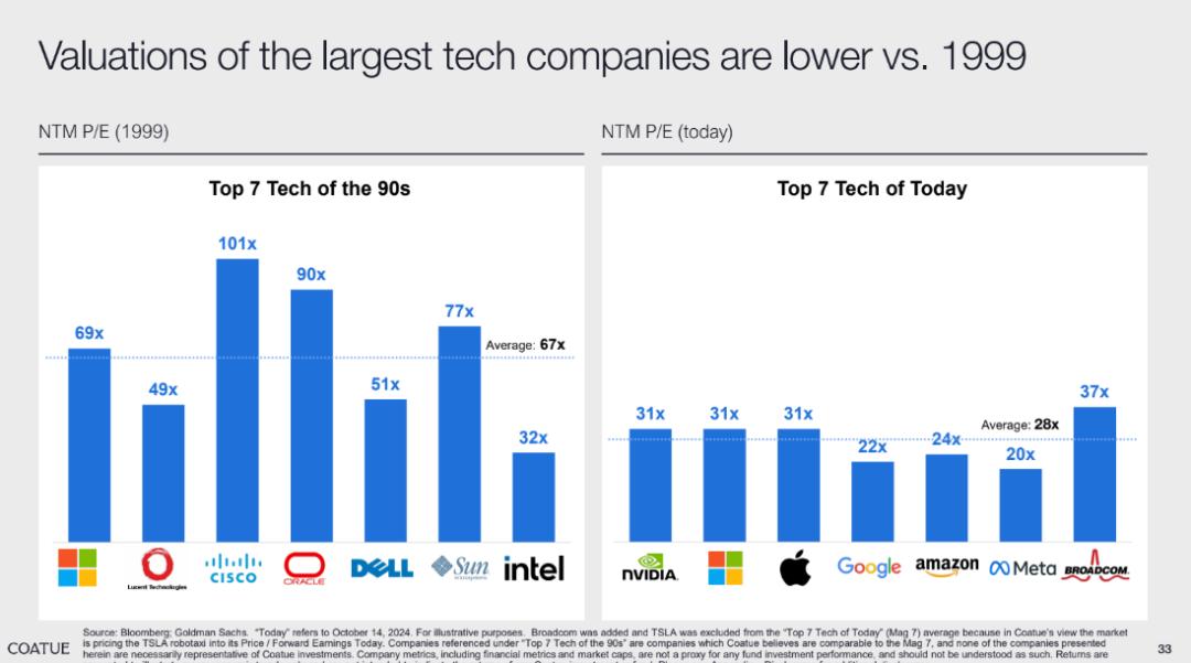 如果进一步从历史维度看 Top 7 科技公司的 PE 倍数,90 年代 Top 7 Tech 平均 PE 倍数为 67x,而当前 Top 7 Tech 平均 PE 倍数仅为 28x,显著低于互联网泡沫时期。