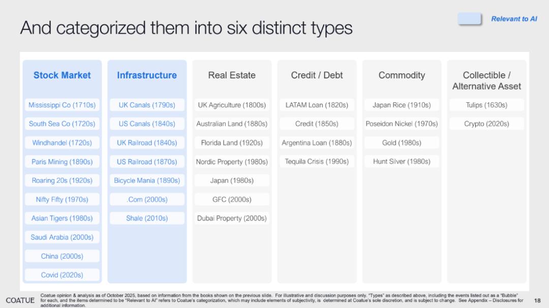 Coatue 认为,今天的 AI 投资热潮在特征上最接近“股票市场”和“基础设施”型泡沫:由技术革新推动,伴随巨额资本投入与高涨预期。