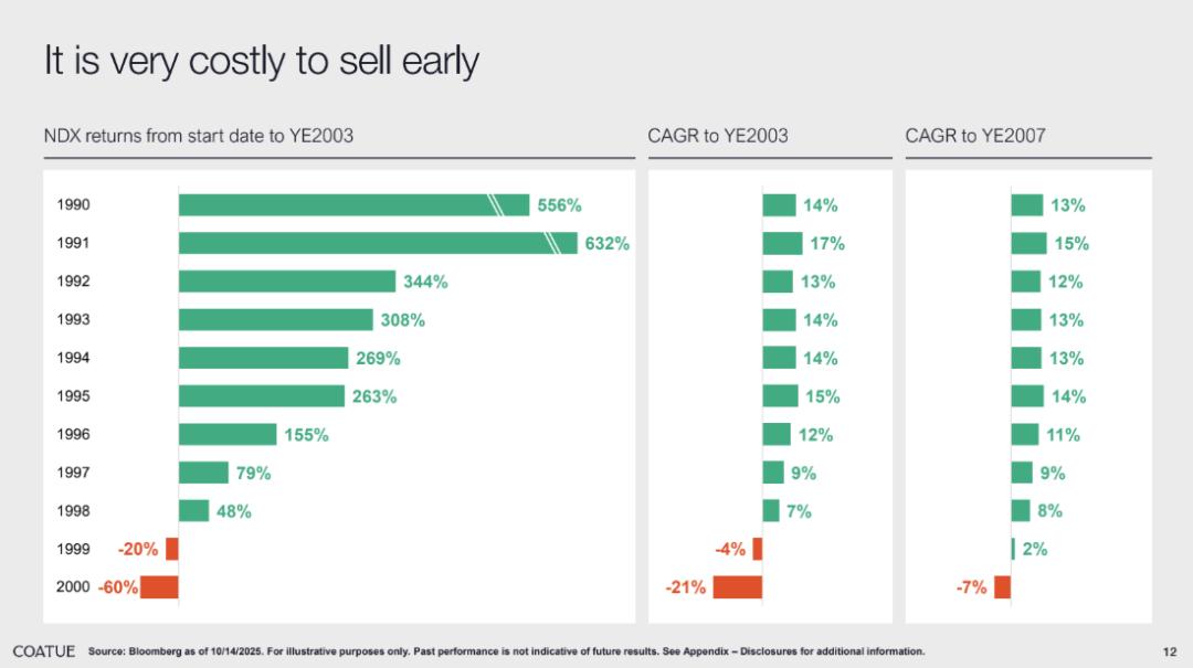 针对 “何时卖出 AI 资产” 的问题,Coatue 结合历史数据回顾分析再次强调 “长期持有” 的重要性,反对 “过度关注短期波动”;强调“要更加关注基本面和未来,而不是过去”。