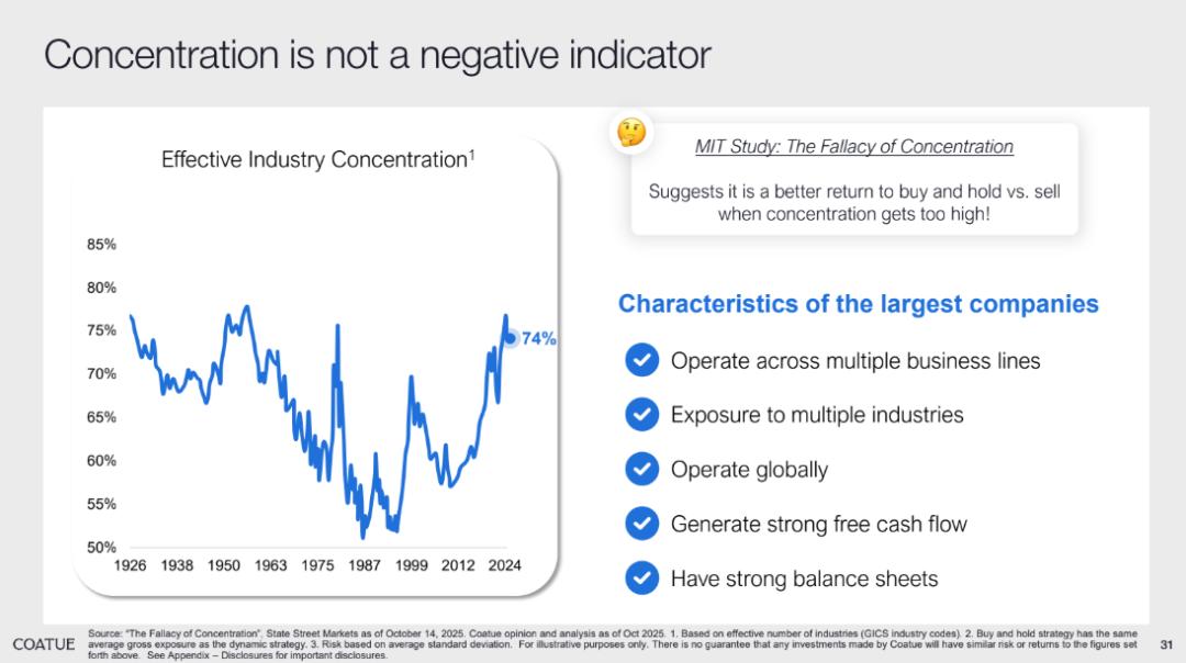 同时,市场对 “高头部企业集中度” 的担忧往往带有片面性。MIT 的 The Fallacy of Concentration 研究指出,这种集中度并非负面信号 —— 相反,当集中度较高时,“buy and hold” 策略的回报优于频繁卖出的策略。