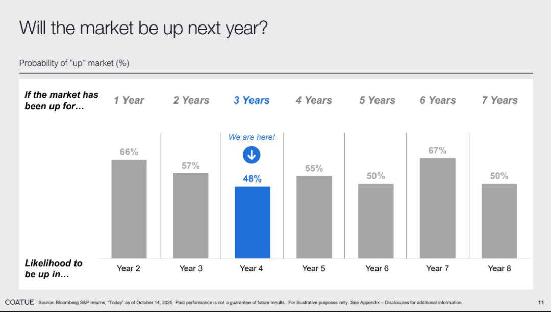 •今年是本轮 AI 牛市的第 3 年,基于历史数据来看,市场在明年还有 48% 的概率持续上涨;