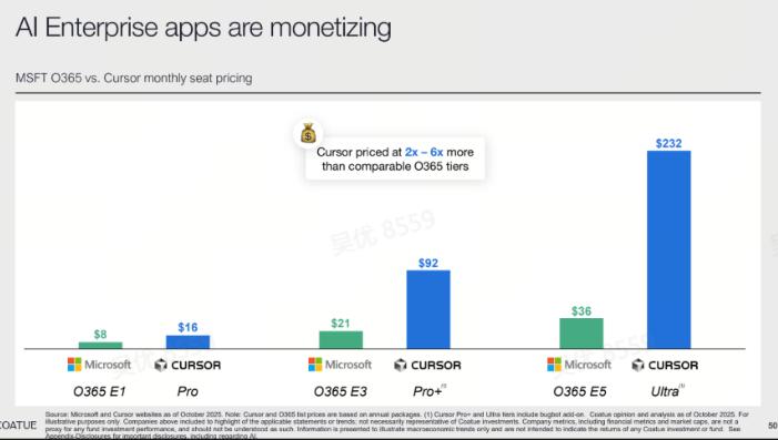 企业 AI 应用的商业化能力已通过 “高价值定价” 得到验证。Cursor 的订阅定价远超微软 Office 365:以顶级版本为例,Cursor Ultra 定价 232 美元 / 月,而微软 O365 E5 仅 36 美元 / 月,Cursor 的定价达到同类办公软件的 2-6 倍。