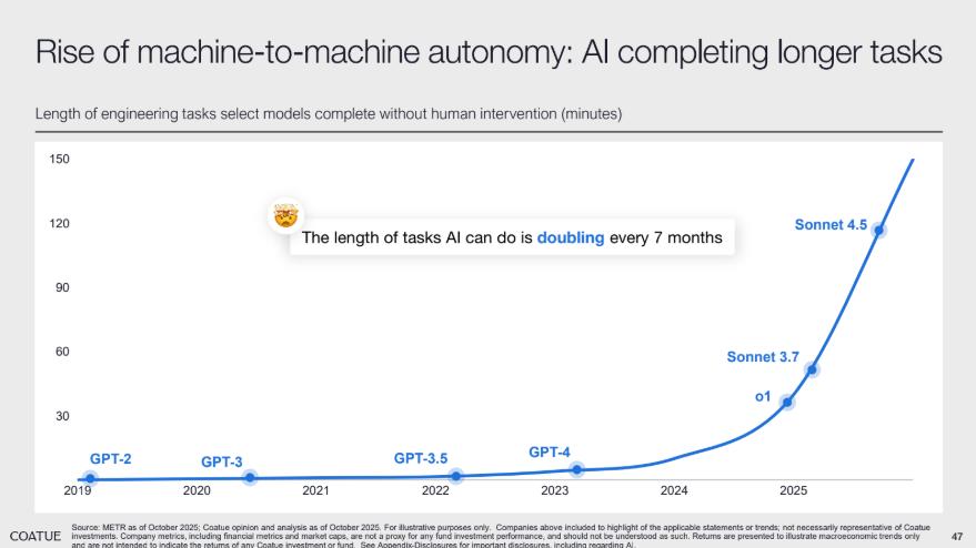 下图展示了不同 AI 模型无需人类干预即可完成的工程任务时长,从 GPT-2 到 Sonnet 4.5,任务处理时长呈指数级增长,每 7 个月就能实现任务时长翻倍。而这条曲线预计将在未来几年显著持续提高。这种进化让 AI 从 copilot 升级为可独立执行复杂流程的 agent。