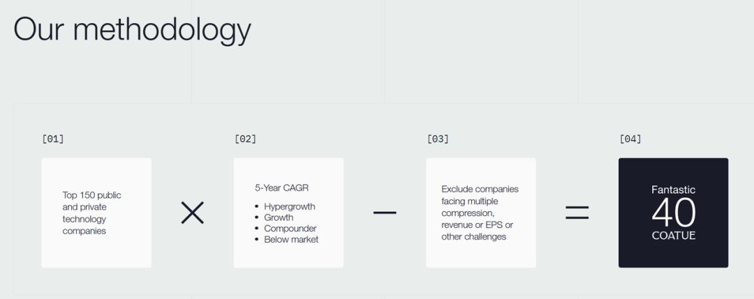 今年夏天,Coatue 发布了“Fantastic 40” 指数(The Fantastic 40 Growth & Innovation Index)。“Fantastic 40”的评选方法为:先筛选出顶尖的 150 家科技企业,再基于 5 年期 CAGR,从超高速增长、增长、复合增长及低于市场增长等维度进行评估,最后排除那些面临估值压缩、营收或 EPS 等其他挑战的企业,最终选出 40 家企业构成该指数。