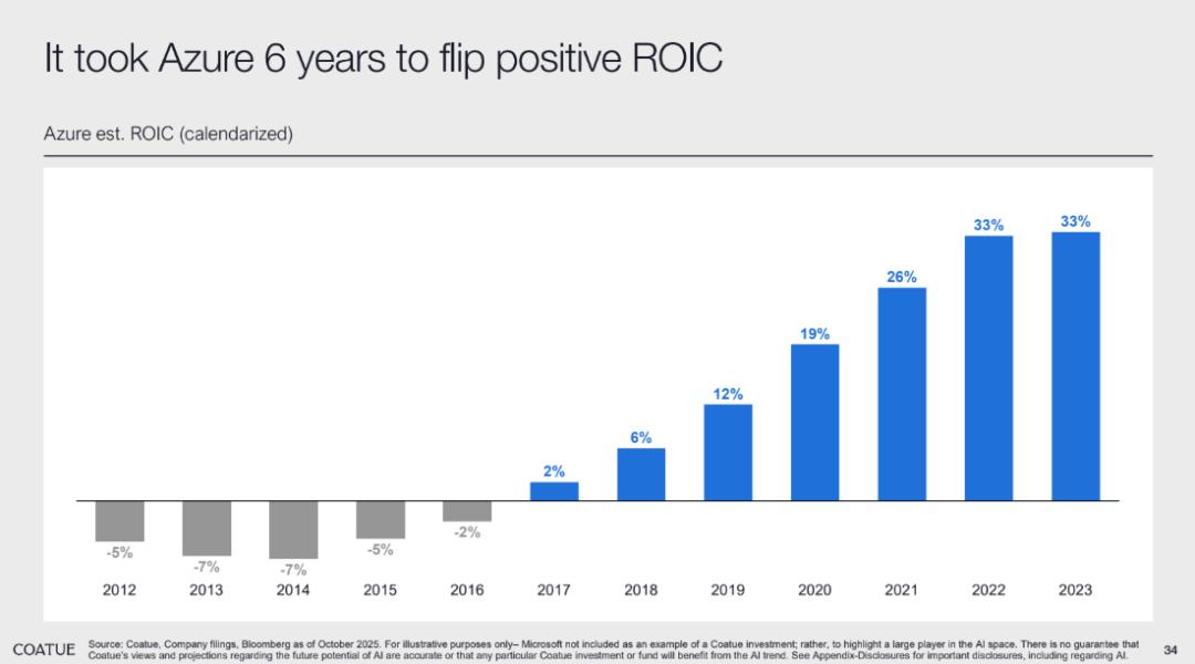 Coatue 以 Azure 的发展历程为例反驳了这种担忧 。Azure 从投入到实现正的投资资本回报率(ROIC)花了 6 年时间,在最终成长为云计算领域的巨头后,后期的回报水平持续攀升。